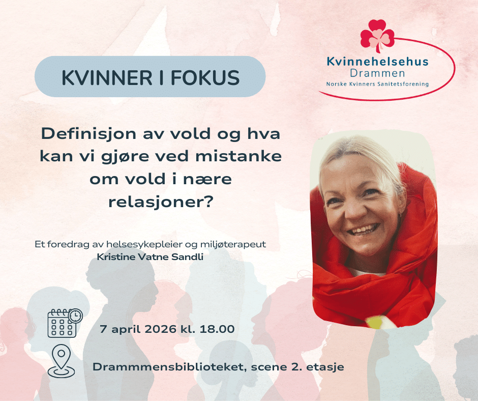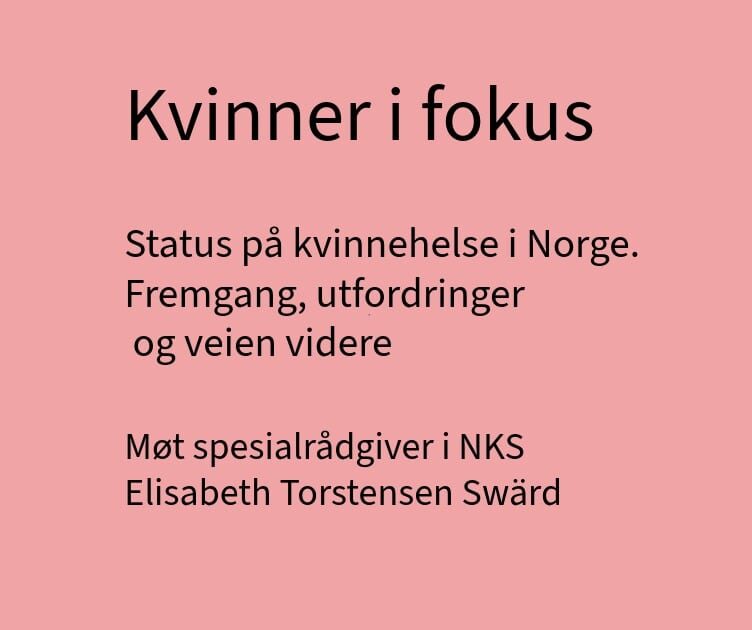 Kvinner i fokus er et gratis og åpent temamøte i regi av Drammen Sanitetsforening og Kvinnehelsehuset. Denne gangen møter vi spesialrådgiver i kvinnehelse Elisabeth T. Sward fra NKS, som gir oss den nyeste statusen på norsk kvinnehelse – med fokus på fremgang, utfordringer og veien videre.