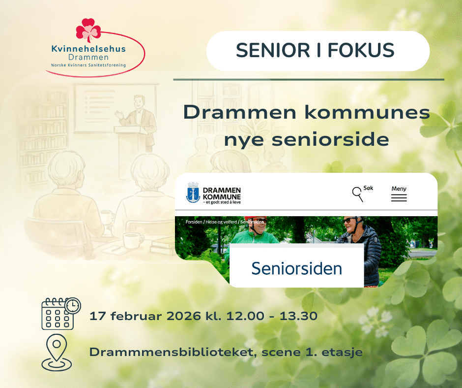 Velkommen til gratis og åpent møte for seniorer på Drammensbiblioteket i regi av Drammen sanitetsforening og Kvinnehelsehus.